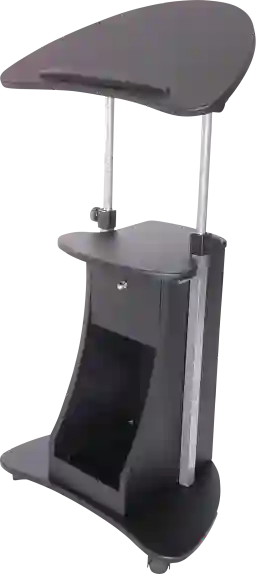 The Liotre sit-to-stand rolling laptop cart, styled in a sleek black color, features both an open and a closed storage section. Its adjustable panel can be tilted to your preference and is equipped with a safety edge-stopper to ensure your laptop remains securely in place. Constructed from robust MDF wood panels and coated with a moisture-resistant PVC laminate veneer, this cart is designed for durability. The table panel is not only tiltable but also height-adjustable from 31.5 to 45.5 inches, easily modified using the twin knobs. Customer assembly is required.
