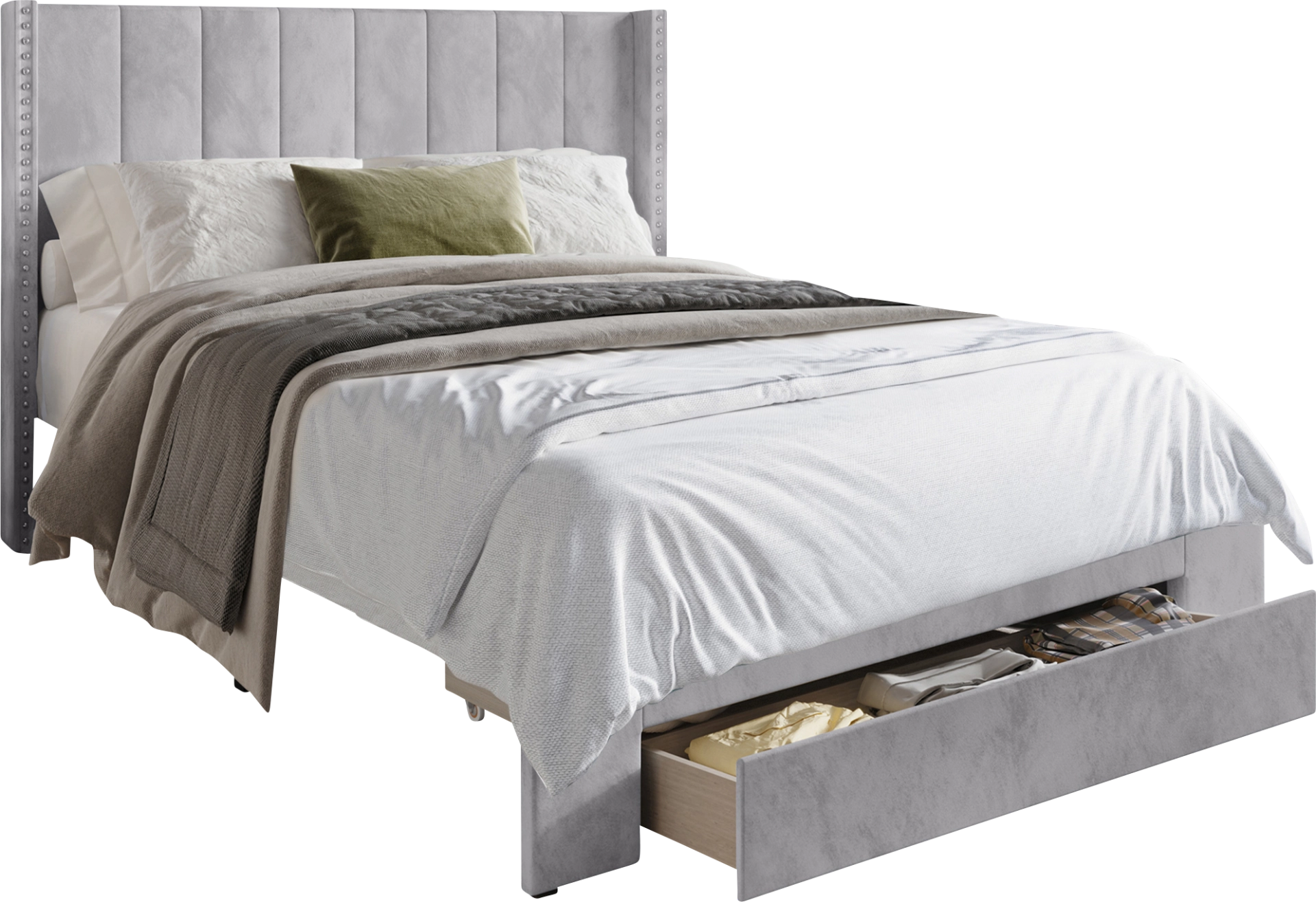 The Lischey is a platform bed, a multi-functional piece ideal for small living space as well as create a timeless look for an elegant bedroom style. It includes the wingback panel headboard with button tufting and nail head on the headboard as well as the bed skirts on the side rail to grab attention and enhance your room's appearance. The oversize storage drawer in the front of footboard offers extra space to put blankets, pillows, and your favorite things. The bed frame is built from solid wood, padded with comfy foam, and upholstered in skin-friendly velvet finish. Customer assembly is required.