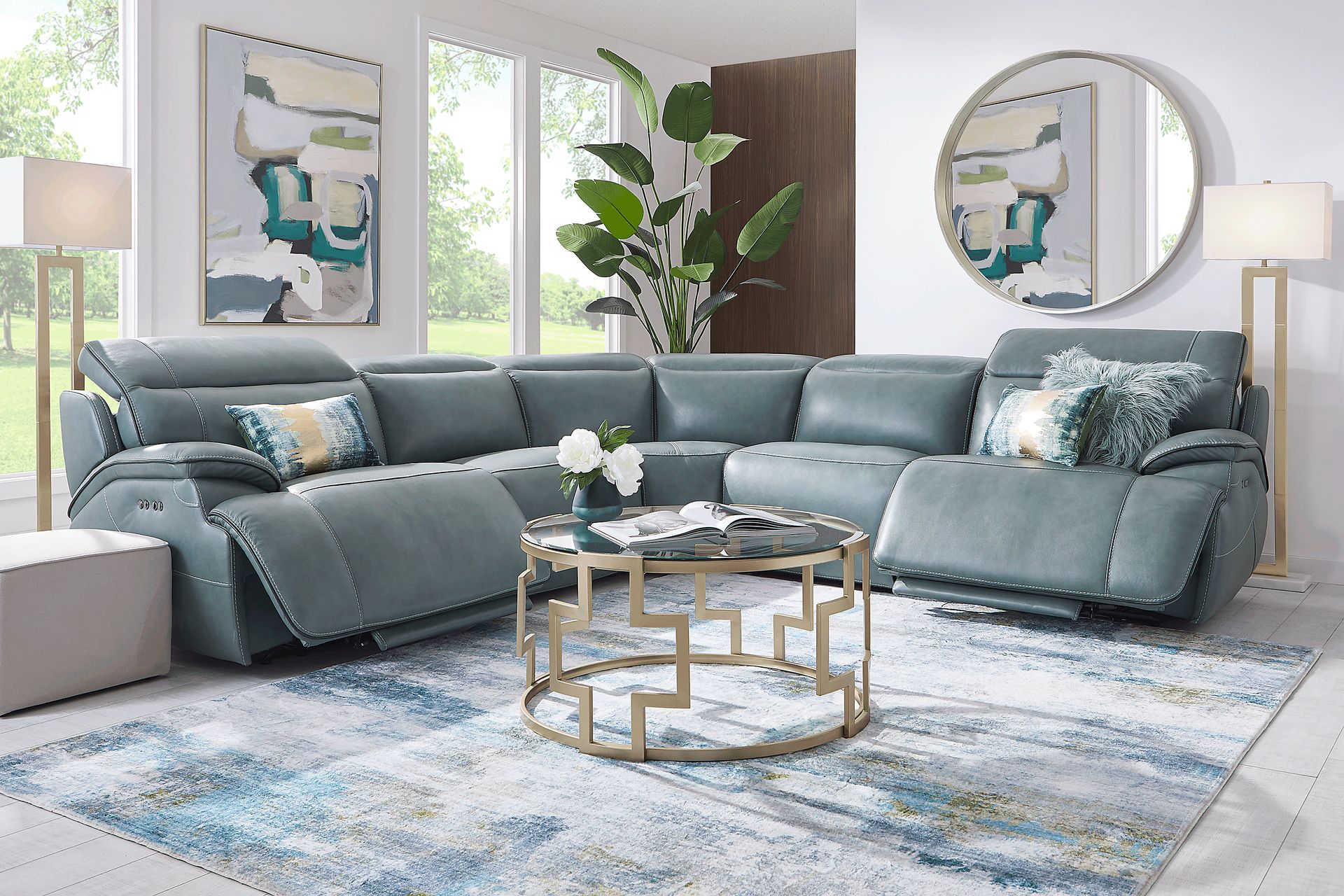 Create a lounge-worthy living room setup your friends and family will love with the stylish Livata sectional. Upholstered in lagoon blue-colored top grain leather where the body touches, this spacious piece features padded arms for additional comfort. It's dual power reclining system allows you to adjust the headrest and footrest to your desired position, allowing you to truly customize your lounging experience. Upholstery: Top grain leather where the body touches and vinyl sides and backs.