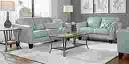For sleek sophistication and understated elegance look no further than the Livorno living room. This beautiful collection is upholstered in supple top grain leather in a fresh aqua color. Designed with rolled arms and tapered legs, each piece is finished with exquisite stitching detail and chic tufted cushions. The 84 inch transitional sofa - perfectly sized for any living space will be a stunning centerpiece for almost any setting. Upholstery: Top Grain Leather Where the Body Touches and Blended Leather (polyirethane fabric blended with leather particles) sides and backs. Leather is a durable, low maintenance product, however, general regular maintenance is necessary. To keep your leather clean, vacuum it regularly, removing any dust, and clean it with water and a mild non-detergent soap. Accent pillows not included. Tables not as shown in room image.
