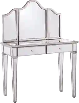 Add a touch of glam to your design with the Llanfair silver vanity with mirror. Two mirrored drawers offer plenty of storage for makeup and accessories, while a spacious tabletop and arched mirror let you prep for the day in style. Perfect for both small spaces and open concept floorplans, this mirrored set slides neatly into your formal dressing area or works alongside your existing bathroom or master suite design. Give your routine a modern upgrade with this chic vanity desk. Customer assembly is required.