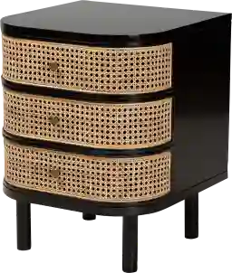 Support the needs of your home while imbuing a soothing ambiance with the remarkable design of the Lochdoon black nightstand. This bohemian piece is crafted from solid Bayur wood. Three drawers offer discreet storage for household essentials while woven rattan embellishments lend a traditional feel. With a spacious tabletop, this versatile piece also serves as a convenient end table in shared spaces. The Lochdoon features round drawer knobs that beautifully stand out against the rattan for an eye-catching touch. Due to the nature of the natural materials used in this product, it may have variations in areas such as, but not limited to, color, pattern, grain and texture. The hair-like strands of rattan/rattan-fiber are common due to the nature of the material. Customer assembly is required.