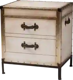 Lend a touch of industrial-style flair to your space with the stunning Lochiel I white end table. This vintage inspired piece consists of a sturdy wood frame wrapped in smooth canvas. Metal-plated edges and studded embellishments highlight the robust nature of the piece while two drawers offer convenient storage for a variety of household essentials. The Lochiel I will arrive fully assembled and utilizes minimalist metal base with rounded legs for excellent stability and support. Beautifully shaped leather strips complete the look, making the Lochiel I an enthralling addition to any space.