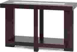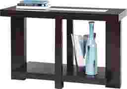 Modern elegance at its finest, the Lochlin sofa table's clean lines of various widths give it a fresh, contemporary appeal. A beautiful beveled glass insert on the tabletop offers a nice contrast to the dark walnut finish of the birch solids and veneers.