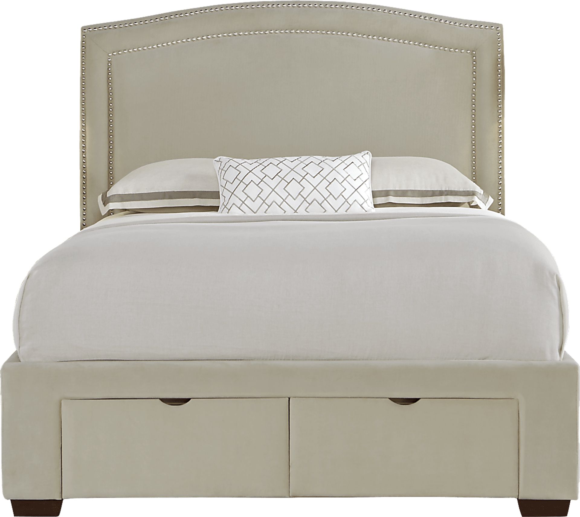 A classic design and sophisticated silhouette make the Loden queen bed a wonderful addition to your bedroom. Soft beige colored upholstery is accented with a double row of nailheads along the headboard, bringing a subtle dose of glamour and a clean look that remains timelessly elegant. Two drawers on the footboard enhance its storage capabilities. 100% polyester. Mattress only- No boxspring/foundation required.