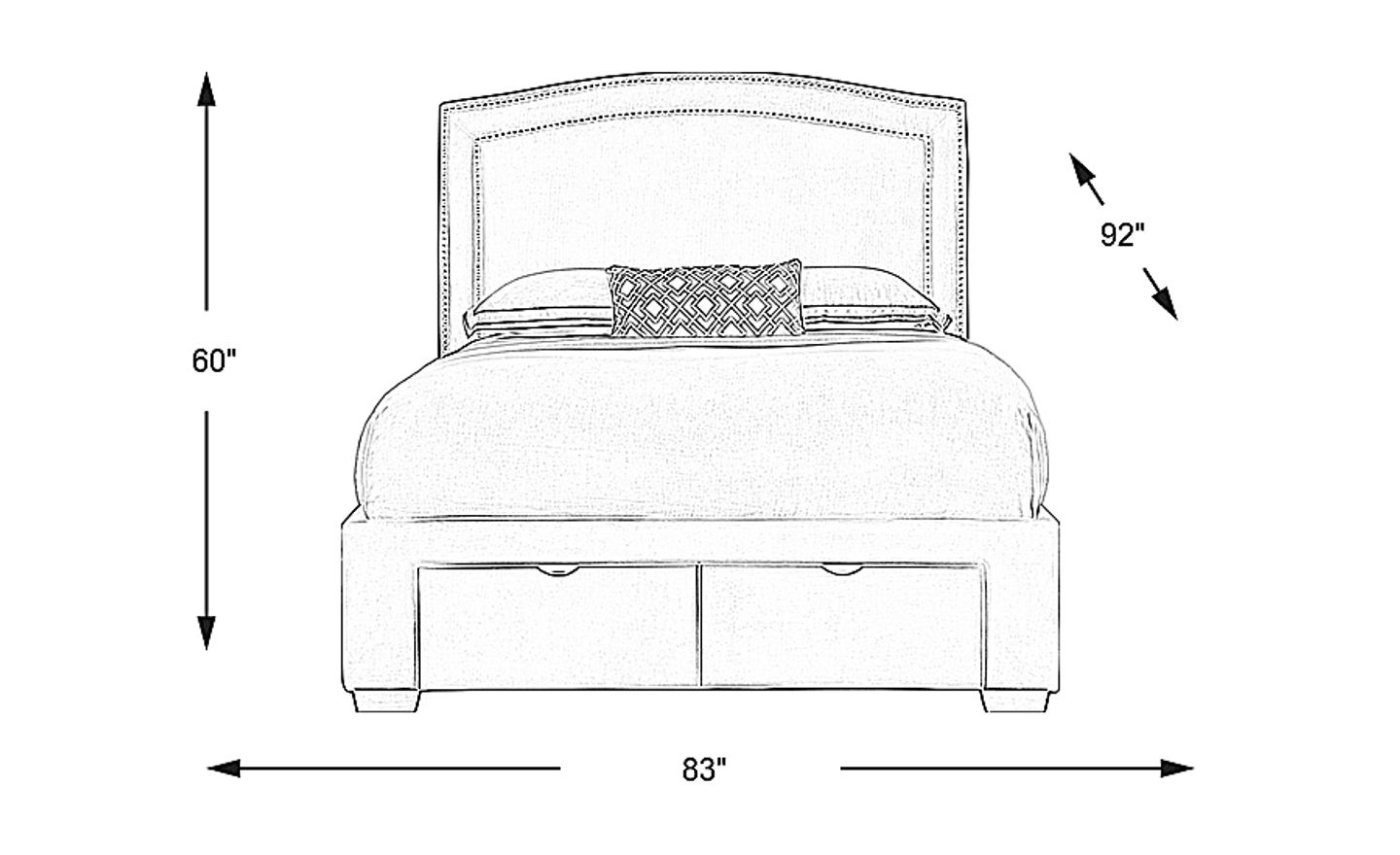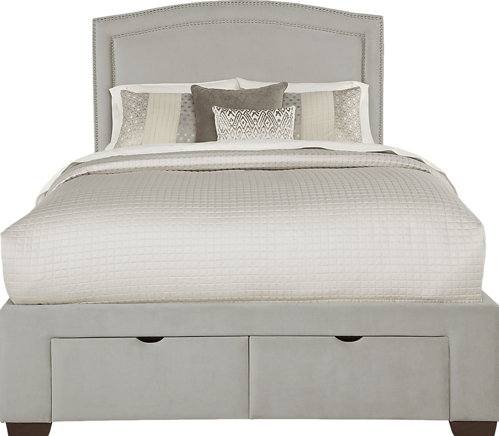 A classic design and sophisticated silhouette make the Loden king bed a wonderful addition to your bedroom. Soft gray colored upholstery is accented with a double row of nailheads along the headboard, bringing a subtle dose of glamour and a clean look that remains timelessly elegant. Two drawers on the footboard enhance its storage capabilities. 100% polyester. Mattress only- No boxspring/foundation required. Bed shown is queen size.