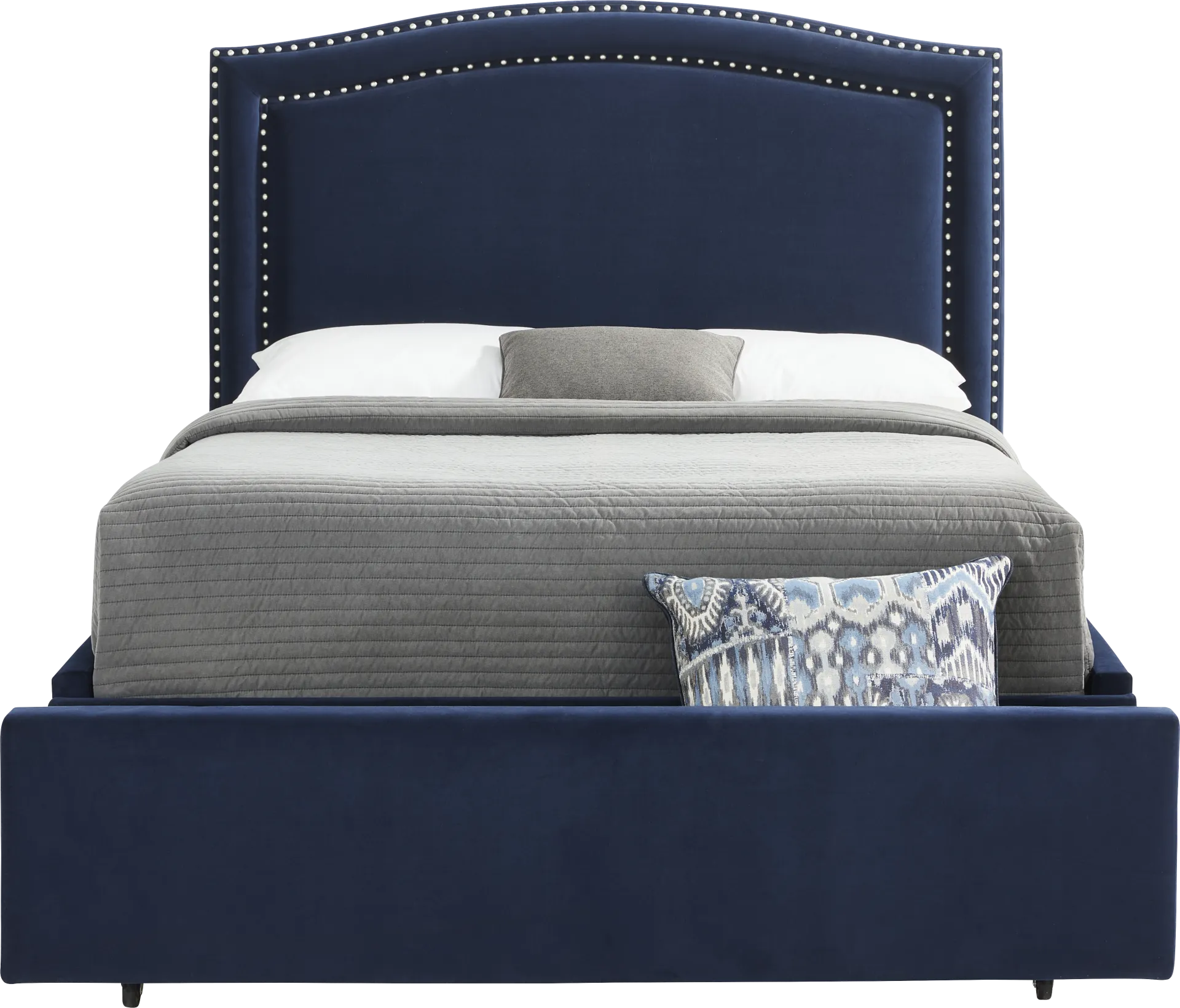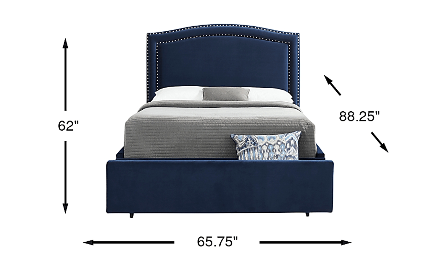 A contemporary design and classic silhouette make the Loden II bed a wonderful addition to your sleep space. Soft blue upholstery is accented with a double row of nailhead trim along the gentle curves of the headboard, bringing a subtle dose of glamour and a clean look that remains timelessly elegant. Built-in drawers add convenient storage for linens, clothing and more.