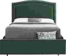 A contemporary design and classic silhouette make the Loden II bed a wonderful addition to your sleep space. Soft green upholstery is accented with a double row of nailhead trim along the gentle curves of the headboard, bringing a subtle dose of glamour and a clean look that remains timelessly elegant. Built-in drawers add convenient storage for linens, clothing and more.