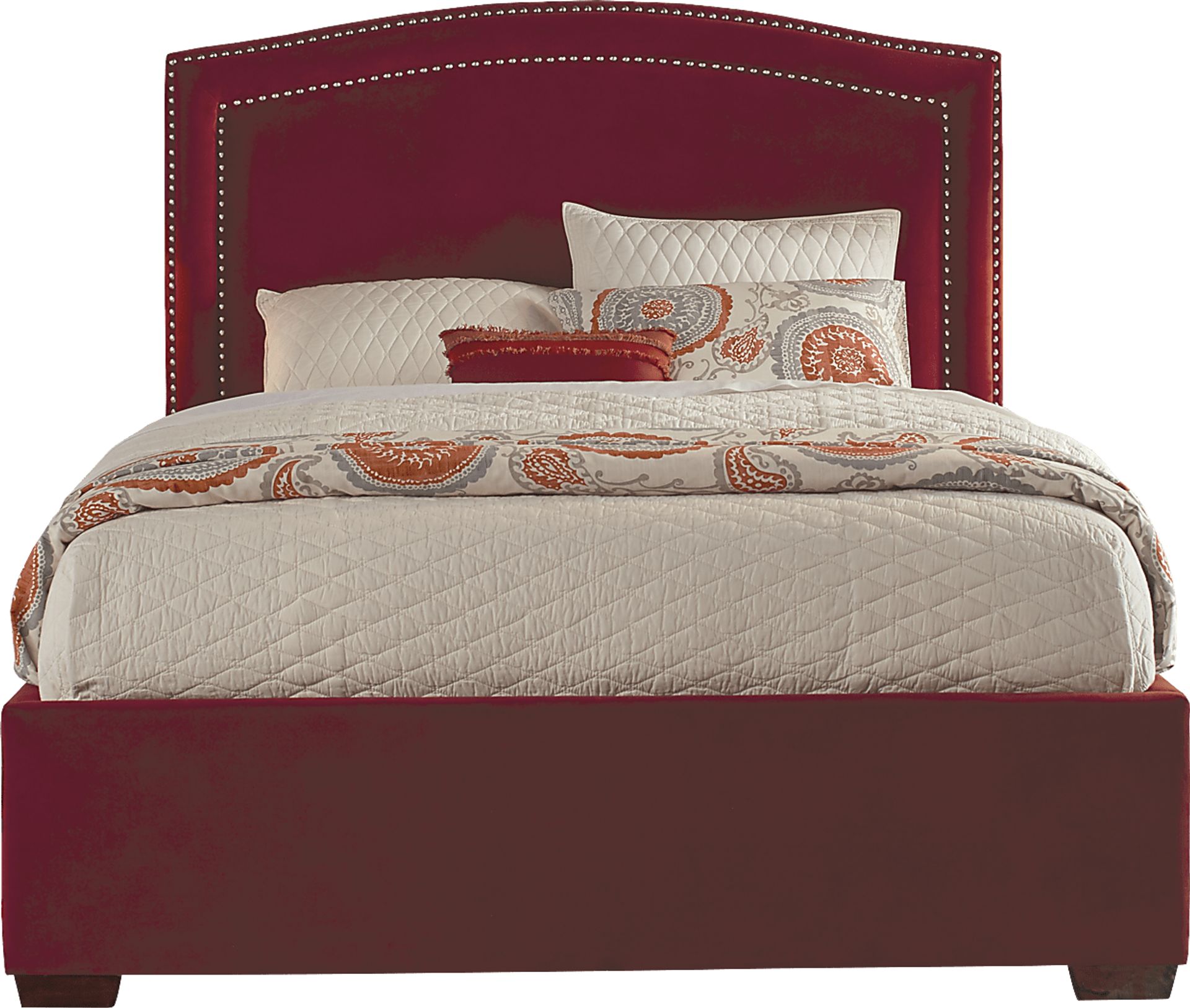 A classic design and sophisticated silhouette make the Loden bed a wonderful addition to your bedroom. Vibrant red upholstery is accented with a double row of nailheads along the headboard, bringing a subtle dose of glamour and a clean look that remains timelessly elegant. 100% Polyester. Mattress and foundation (if required) sold separately. Bed shown is queen size.