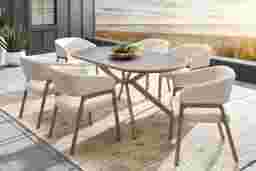 Raw, nature-inspired appeal meets modern comfort along the sweeping curves of the Logen patio dining set. Mid-century modern to its core, this collection features an oval table with a durable sintered stone top perched on a weather resistant aluminum frame. Six upholstered arm chairs echo the canted legs and low-maintenance heat transfer woodgrain finish of the table, with plush cushions in beige attached to the seats and backs.
