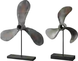 Given their nautical "boat propeller" theme, these sculptures are an excellent fit for coastal or lakefront properties. While they are finished with a protective gray glaze, rust brown tones, and green tarnish to mimic weathered metal, they are designed for indoor use. The matte black steel base provides significant structural stability, ensuring they remain secure on your surfaces even in breezier shoreline homes.