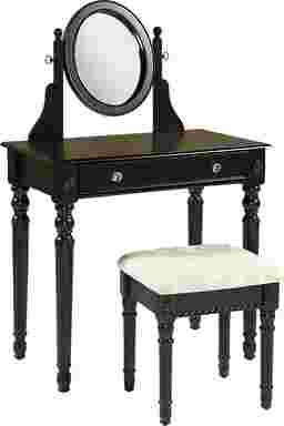 The traditional style of the Loraine vanity set features intricately designed spindle legs and a chic black finish. Enjoy some much needed personal grooming space with this attractive vanity, mirror and stool set that offers a timeless place to prepare for the day ahead. The vanity features an adjustable mirror and a single generously sized drawer, with acrylic pull knobs. The spacious table top has room for an array of cosmetics, jewelry, perfume, or other beauty supplies. The included stool features a thickly padded seat cushion in a neutral shade of off-white, for further comfort. 250 pound limitCustomer assembly required