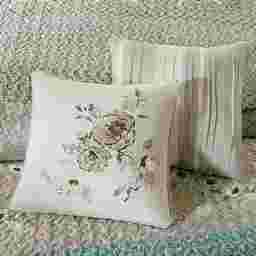 Give your bedroom a cozy country vibe with the Louque coverlet set. This cotton sateen coverlet and matching shams feature various floral and geometric prints, in green, blue, and yellow colors, to create an updated cottage look. A solid green reverse complements the top of the coverlet and provides an additional way to style your bedroom. Also included are 3 decorative pillows, in coordinating colors and hints of brown, with embroidered details that add textural elements to the quilted coverlet set. Machine washable for easy care, this reversible cotton coverlet set brings a trendy country charm to your bedroom. Items in the set may come in a rolled or compressed packaging, which will need to be fluffed up or steam ironed before use to remove wrinkles. Customer assembly required.