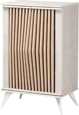 This cabinet features two sliding doors with a unique slatted front design. The sliding door style is a major benefit for high-traffic areas or smaller rooms, as it requires no extra clearance to access your items. Additionally, the slatted design provides a captivating visual display while maintaining the clean, mid-century-inspired lines of the piece.
