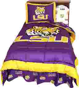 No young football fan's room is complete without the perfect bedding to inspire dreams of winning the big game. All items are 100% cotton sateen, 200 thread count for a wonderfully soft feel. Comforter has your favorite university's logo printed large on front with an all over logo pattern printed on the back giving you a reversible comforter with two unique looks. This set includes a twin comforter and one pillow sham. Machine Washable