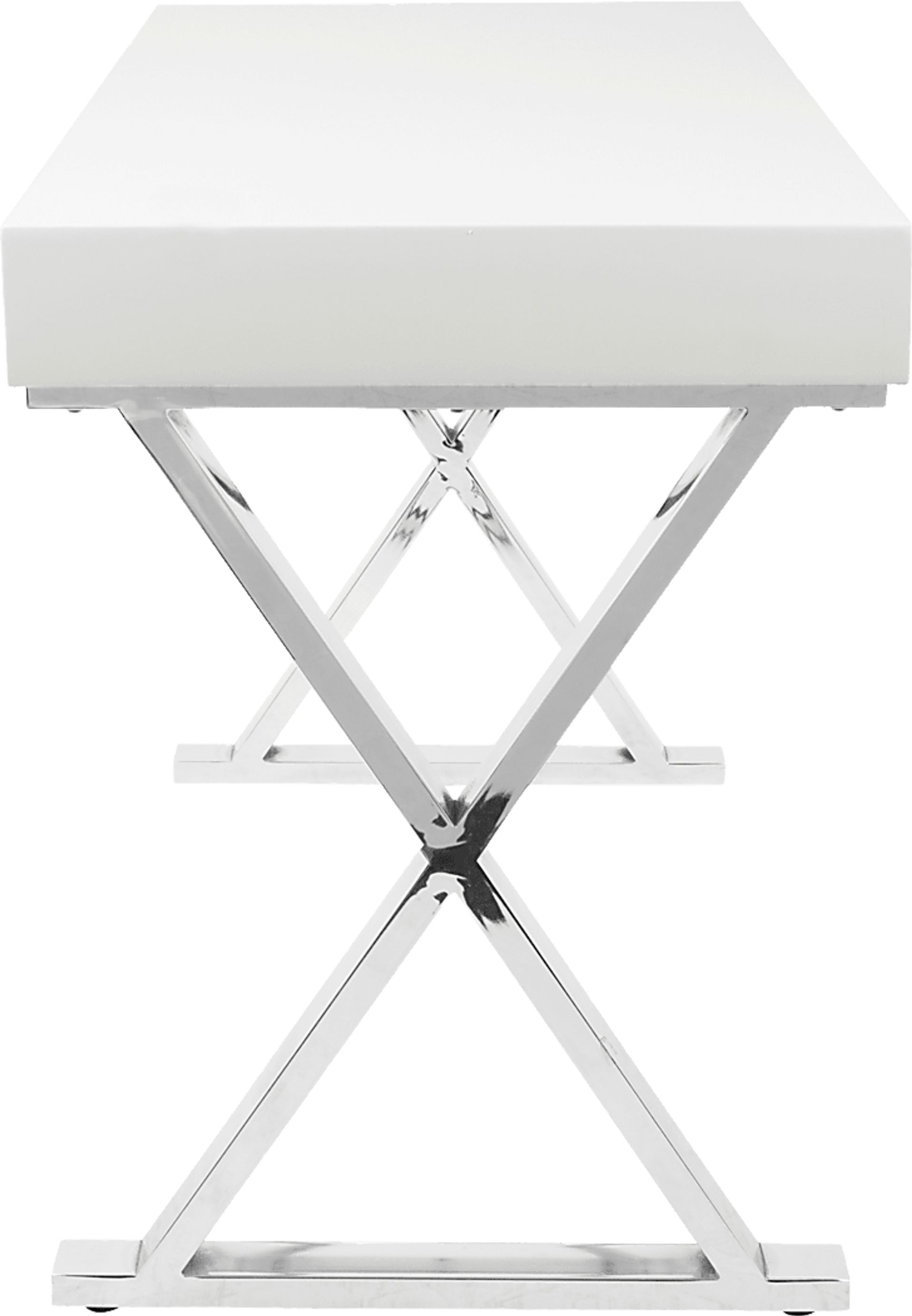 Add glamour to your work space with the beautiful gloss finish of the Luster white desk. A thick white top and pullout drawer provide an optimal work space, while supporting chrome-finished X-shaped legs add a truly stylish appeal. Some customer assembly required.