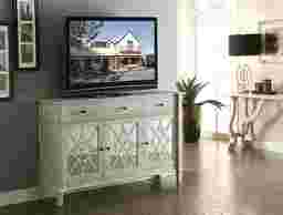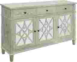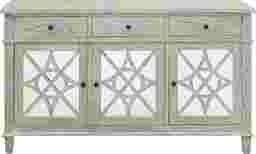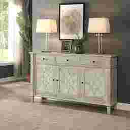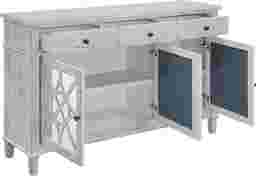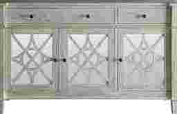 Place this Luton three door three drawer credenza into your dining room to hold extra linens, candles and serving utensils. Finished in a distressed white rub with an intriguing pattern overlaying the mirrored door fronts, for a look that will complement decors from cottage to coastal to urban chic. Customer assembly is required. Customer assembly required.