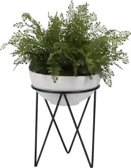 Yes, this piece is a complete decorative solution. It features the artificial maidenhair fern professionally potted in a modern white bowl, which sits securely within a minimalist metal stand. The elevated stand brings the total height to 34 inches, making it a perfect mid-sized floor accent or a substantial piece for a low side table.