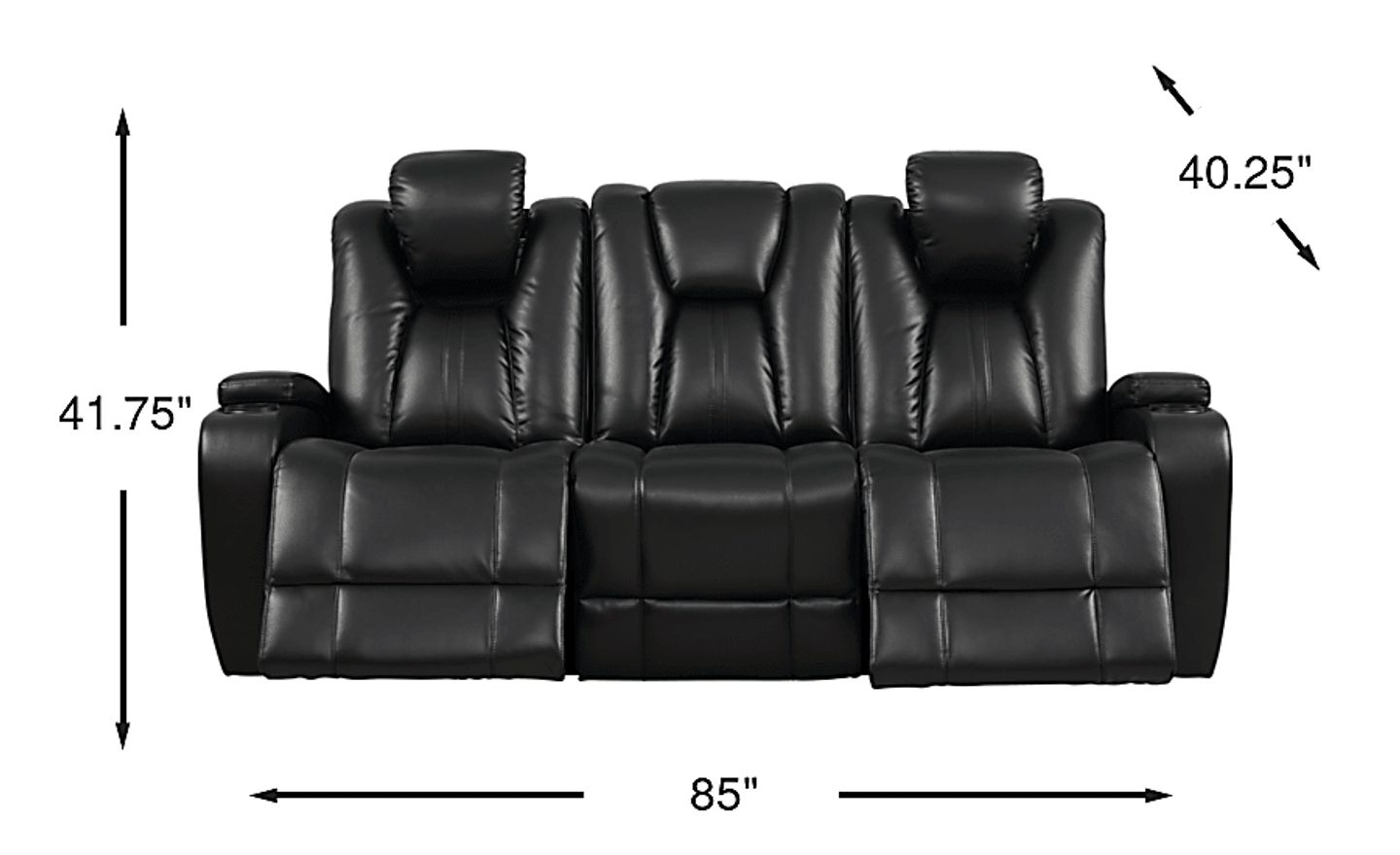 Welcome to your new home base. Offering innovative technology and unsurpassed comfort, the Madden Park power reclining sofa has everything you need to settle in and stay comfy for the long haul. Upholstered in supple yet durable black fabric wherever the body touches, this deluxe sofa features a storage compartment and lighted cupholder in each armrest in addition to a fold down center seat back boasting a burl finished tray with two cupholders, adjustable LED touch lighting, and pop-up media strip with dual A/C adaptors and dual USB ports. Dual power adjustable headrests and reclining footrests keep every inch of your body supported with the touch of a button. Featuring theater style track lighting on the bottom rail, this sofa transforms your living room into a home theater. 85% Polyester; 15% Polyurethane.