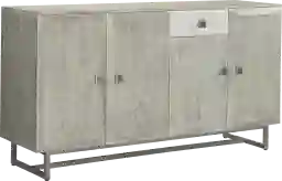 This elegantly designed Madeira credenza is constructed from durable mango wood, finished with a light gray hue, and supported by a sophisticated iron frame. Its distinctive appearance adds a touch of sophistication to any living space. The credenza is equipped with four doors that open effortlessly with upgraded European hinges, revealing a generously sized interior with three adjustable shelves. Furthermore, it comes with a single drawer that features a white marble accented front panel, positioned above one of the doors, adding an extra touch of style to this already impressive piece. Customer assembly is required.