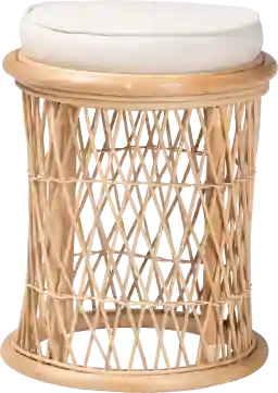 Exhibit an air of carefree elegance in your space with the lovely Madelynn brown ottoman. This bohemian piece is handcrafted from natural rattan by skilled artisans and is topped with a removable fabric-upholstered cushion. Its round silhouette displays a beautiful openwork design adorned with rattan pole for a beautifully airy design from any angle. The Madelynn will arrive fully assembled and serves as a fantastic footstool or extra seating as needed. Boasting exotic grace in handy design, the Madelynn brings serenity to any arrangement. Rattan is a product of nature and may have variations in areas such as, but not limited to, color, pattern, grain and texture. The hair-like strands of rattan/rattan-fiber are common due to the nature of the material.