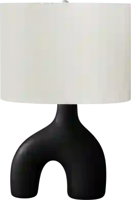 The mid-century inspired "two-leg" shape and timeless black-and-ivory color palette allow this lamp to serve as a versatile accent. It pairs exceptionally well with contemporary furniture featuring clean lines or dark wood finishes. For a cohesive and curated look, our design experts suggest pairing it with other geometric decor or matching it with another color from the Madola Island collection, such as Dove or White, to create a balanced, symmetrical setup.