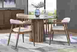 Packing the warmth and charm of a Spanish mealtime staple, the Madrid table spices up your dining room style with a hot look fashioned together by the heart and soul of gathering in intimate celebration. Crafted of hardwood solids with walnut veneers finished in matching walnut, this contemporary piece features a round tabletop with a sunburst pattern. It sits on a pedestal base with a slatted design.