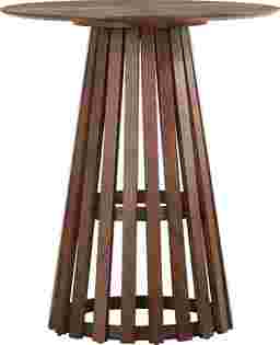 The pedestal base on this table is specifically designed to maximize legroom and seating flexibility. Unlike traditional tables with corner legs that can restrict chair placement and lead to "banging knees," a central pedestal allows you to tuck stools in more closely and provides unobstructed floor space. The slatted design of the base also adds structural stability without the heavy visual weight of a solid column, keeping your dining area looking light and airy.