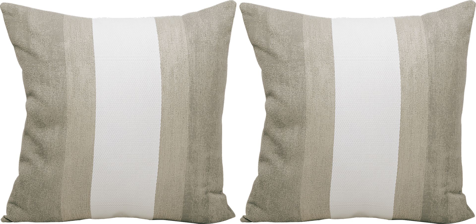 Incorporate contemporary character into your space with the addition of the Madura Taupe accent pillows. Adorned with a modern inspired stripe design over a neutral beige hue and Sunbrella fabric, this pair of pillows offers a practical blend of style and utility to enhance any room.