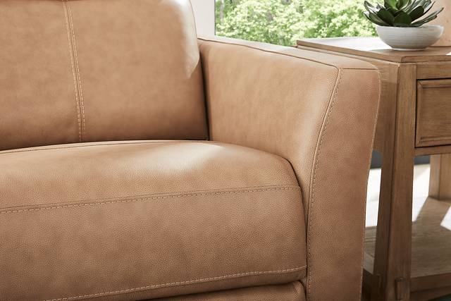 Harmony, comfort and modern elegance fill your room like a melodic symphony with the Maestro collection guiding every note and nuance with effortless flair. This contemporary dual power recliner features head and footrests that can be raised or lowered to any desired position. An integrated control panel on the outside of the piece has a USB port that makes charging to your mobile devices directly from the unit easy and convenient. Upholstered with top grain leather where the body touches in a soothing sand color, the look wouldn't be complete without stylish radius arms and top-stitched outer seams that tailor the recliner to perfection. Upholstery: Top grain leather where the body touches. Polyurethane sides and backs.