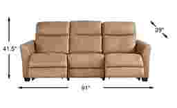 Harmony, comfort and modern elegance fill your room like a melodic symphony with the Maestro collection guiding every note and nuance with effortless flair. This contemporary dual power reclining sofa features head and footrests that can be raised or lowered to any desired position. Integrated control panels on the outside of the piece have USB ports that make charging to your mobile devices directly from the unit easy and convenient. Upholstered with top grain leather where the body touches in a soothing sand color, the look wouldn't be complete without stylish radius arms and top-stitched outer seams that tailor the sofa to perfection. Upholstery: Top grain leather where the body touches. Polyurethane sides and backs.