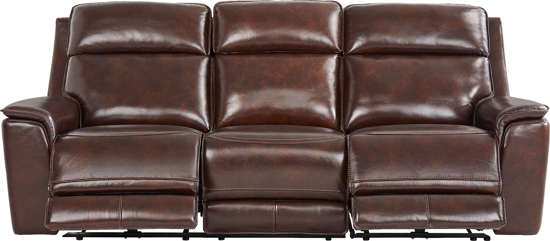The luxury of a weekend retreat grounded in the familiar calm of home, the Magellan collection's inviting frame blends modern comfort with the refined ease of classic style. Confidently transitional, this sofa is upholstered in chocolate brown top grain leather where the body touches. Deep tufted backs and sumptuously padded track arms deliver cradle-like cushioning, while top-stitched seams accentuate the elegant curves and clean lines that define its handsome silhouette. Dual power reclining features adjustable headrest and footrest for personalized relaxation, along with USB ports on each control panel for added convenience. The sofa's center fold down table reveals hidden cupholders and LED reading lights, creating the ideal setup for a cozy reading session and a relaxing beverage. Dual power LAF reclining loveseat, dual power RAF recliner. Upholstery: Top grain leather where the body touches and vinyl sides and backs. Accent pillows not included.