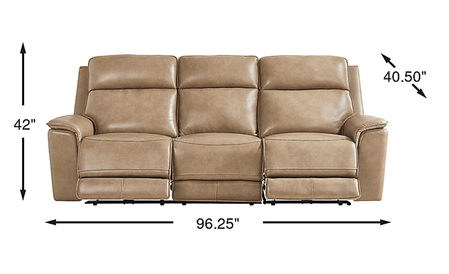 The luxury of a weekend retreat grounded in the familiar calm of home, the Magellan collection's inviting frame blends modern comfort with the refined ease of classic style. Confidently transitional, this sofa is upholstered in sandy brown top grain leather where the body touches. Deep tufted backs and sumptuously padded track arms deliver cradle-like cushioning, while top-stitched seams accentuate the elegant curves and clean lines that define its handsome silhouette. Dual power reclining features adjustable headrest and footrest for personalized relaxation, along with USB ports on each control panel for added convenience. The sofa's center fold down table reveals hidden cupholders and LED reading lights, creating the ideal setup for a cozy reading session and a relaxing beverage. Dual power LAF reclining loveseat, dual power RAF recliner. Upholstery: Top grain leather where the body touches and vinyl sides and backs. Accent pillows not included.