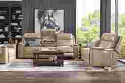 The luxury of a weekend retreat grounded in the familiar calm of home, the Magellan collection's inviting frame blends modern comfort with the refined ease of classic style. Confidently transitional, this sofa is upholstered in sandy brown top grain leather where the body touches. Deep tufted backs and sumptuously padded track arms deliver cradle-like cushioning, while top-stitched seams accentuate the elegant curves and clean lines that define its handsome silhouette. Dual power reclining features adjustable headrest and footrest for personalized relaxation, along with USB ports on each control panel for added convenience. The sofa's center fold down table reveals hidden cupholders and LED reading lights, creating the ideal setup for a cozy reading session and a relaxing beverage. Dual power LAF reclining loveseat, dual power RAF recliner. Upholstery: Top grain leather where the body touches and vinyl sides and backs. Accent pillows not included.