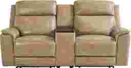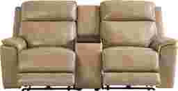 The luxury of a weekend retreat grounded in the familiar calm of home, the Magellan collection's inviting frame blends modern comfort with the refined ease of classic style. Confidently transitional, this loveseat is upholstered in sandy brown top grain leather where the body touches. Deep tufted backs and sumptuously padded track arms deliver cradle-like cushioning, while top-stitched seams accentuate the elegant curves and clean lines that define its handsome silhouette. Effortlessly recline with the pull of a handle for further relaxation. To enhance the experience, a wood top center console includes hidden storage, cupholders, and built-in charging ports, making every day lounging effortlessly luxurious. Upholstery: Top grain leather where the body touches and vinyl sides and backs.
