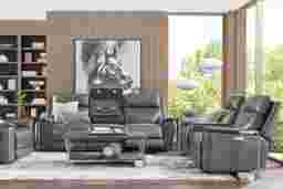 The luxury of a weekend retreat grounded in the familiar calm of home, the Magellan collection's inviting frame blends modern comfort with the refined ease of classic style. Confidently transitional, this living room is upholstered in smokey gray top grain leather where the body touches. Deep tufted backs and sumptuously padded track arms deliver cradle-like cushioning, while top-stitched seams accentuate the elegant curves and clean lines that define its handsome silhouette. Dual power reclining features adjustable headrest and footrest for personalized relaxation, along with USB ports on each control panel for added convenience. The sofa's center fold down table reveals hidden cupholders and LED reading lights, creating the ideal setup for a cozy reading session and a relaxing beverage. The loveseat enhances the experience with a wood top center console that includes hidden storage, cupholders, and built-in charging ports, making every day lounging effortlessly luxurious. Dual power LAF reclining loveseat, dual power RAF recliner, dual power reclining loveseat, USB console. Upholstery: Top grain leather where the body touches and vinyl sides and backs. Leather is a durable, low maintenance product; however, general regular maintenance is necessary. To keep your leather clean, vacuum it regularly, removing any dust, and clean it with water and a mild non-detergent soap. Accent pillows not included.