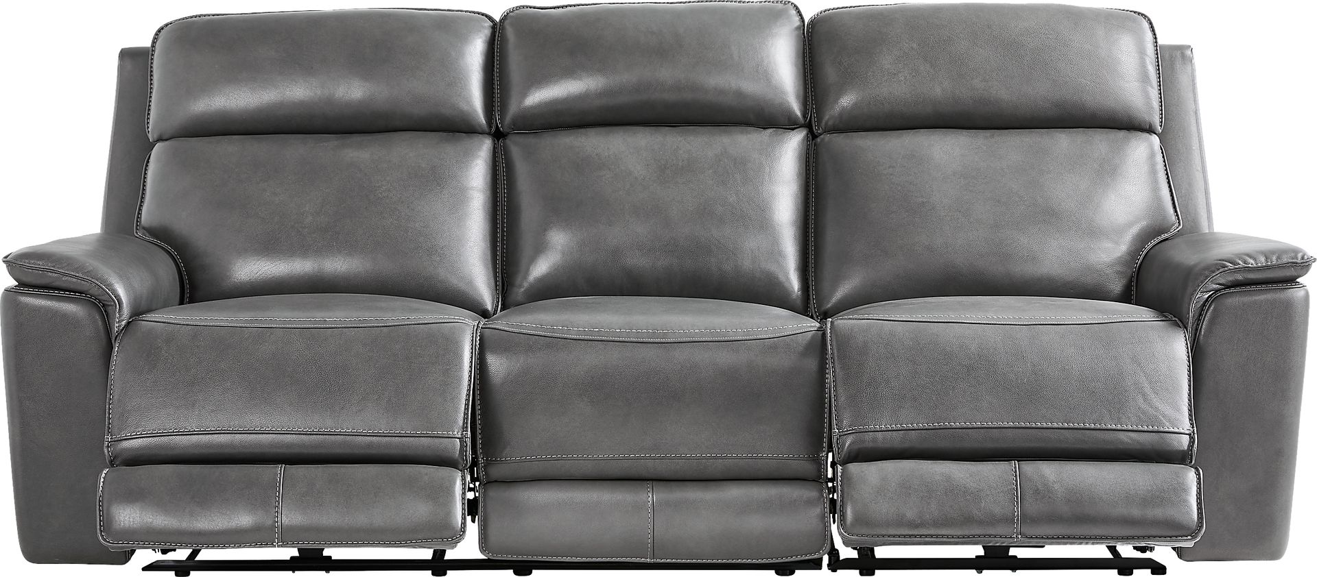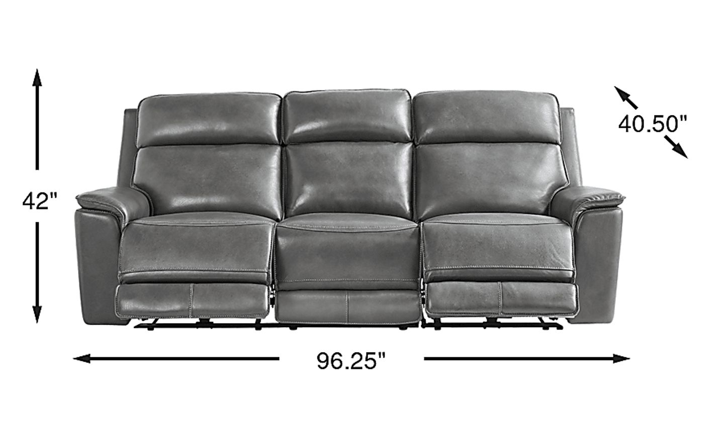The luxury of a weekend retreat grounded in the familiar calm of home, the Magellan collection's inviting frame blends modern comfort with the refined ease of classic style. Confidently transitional, this sofa is upholstered in smokey gray top grain leather where the body touches. Deep tufted backs and sumptuously padded track arms deliver cradle-like cushioning, while top-stitched seams accentuate the elegant curves and clean lines that define its handsome silhouette. Dual power reclining features adjustable headrest and footrest for personalized relaxation, along with USB ports on each control panel for added convenience. The sofa's center fold down table reveals hidden cupholders and LED reading lights, creating the ideal setup for a cozy reading session and a relaxing beverage. Dual power LAF reclining loveseat, dual power RAF recliner. Upholstery: Top grain leather where the body touches and vinyl sides and backs. Accent pillows not included.