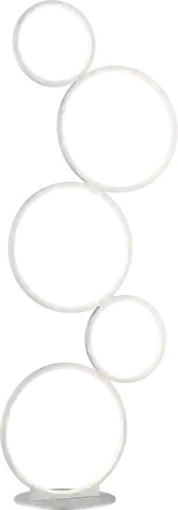 This lamp is designed with five overlapping metal rings of different sizes, each featuring an integrated LED strip. This configuration creates a multi-directional "loop" of light that provides a bright, open glow. While it is powerful enough to illuminate a dark corner or serve as a primary light source in a small office or bedroom, we recommend layering it with other lighting, such as a table lamp, to achieve the most balanced and functional atmosphere in larger rooms.