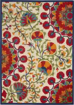 This rug is engineered for long-term wear and color-fastness in all-weather conditions. The fibers are specifically designed to be fade-resistant, which is essential for maintaining the vibrancy of the red, orange, and turquoise floral pattern, especially in high-UV regions like Florida or Texas. To further extend the life of the pigments in extreme sun exposure, we recommend occasionally rotating the rug to ensure even wear across the surface.