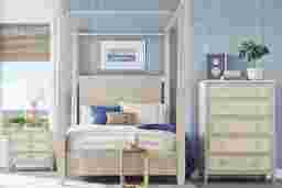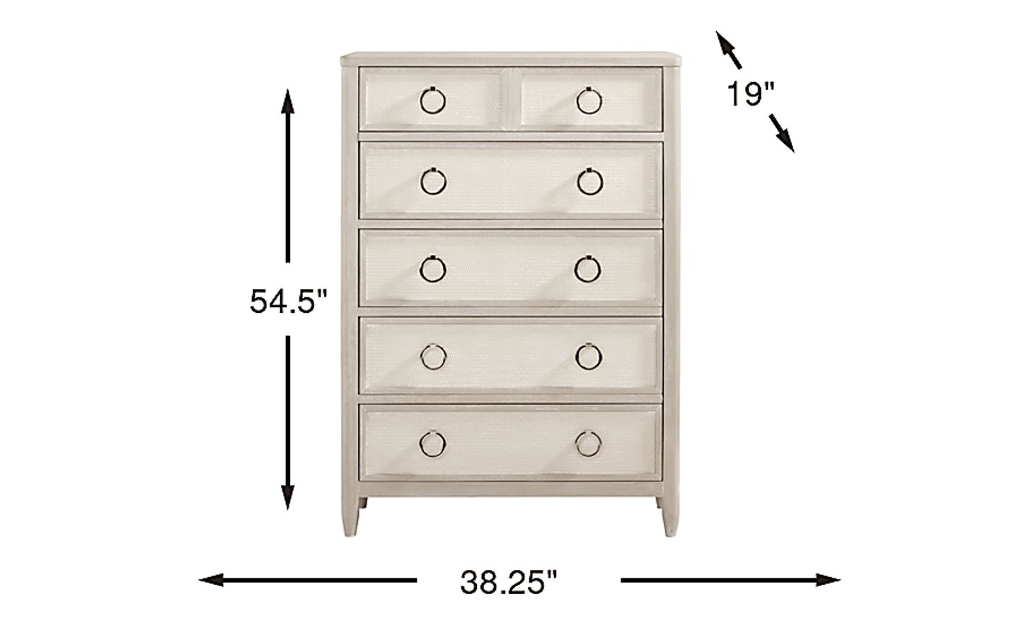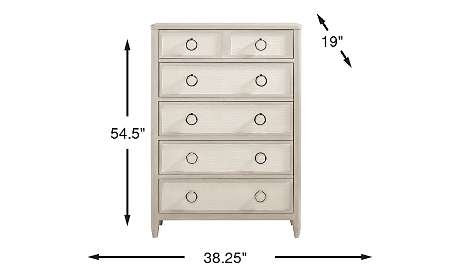 Like a well-traveled trunk reimagined for modern life, the Maldive chest is a keeper of your most important bedroom treasures. Offering five roomy drawers, ideal for clothing, extra linens and everyday essentials, this piece features a gorgeous display of ash veneer work alongside neatly tapered feet. Crafted with front and back English dovetail joinery and smooth ball-bearing glides, each drawer is built for lasting strength and effortless everyday use. Each drawer front is finished with woven detailing that blends coastal charm with polished sophistication. The bottom drawer even features dustproofing. Classic metal ring pulls add just the right touch of gleam, while a pristine white finish keeps the silhouette light, fresh and timeless.