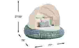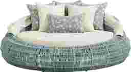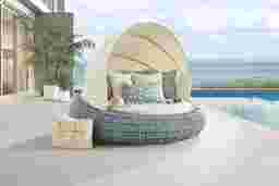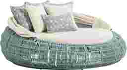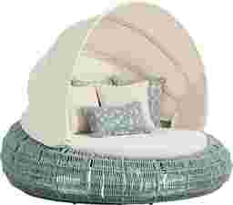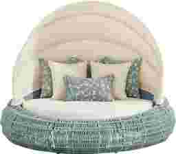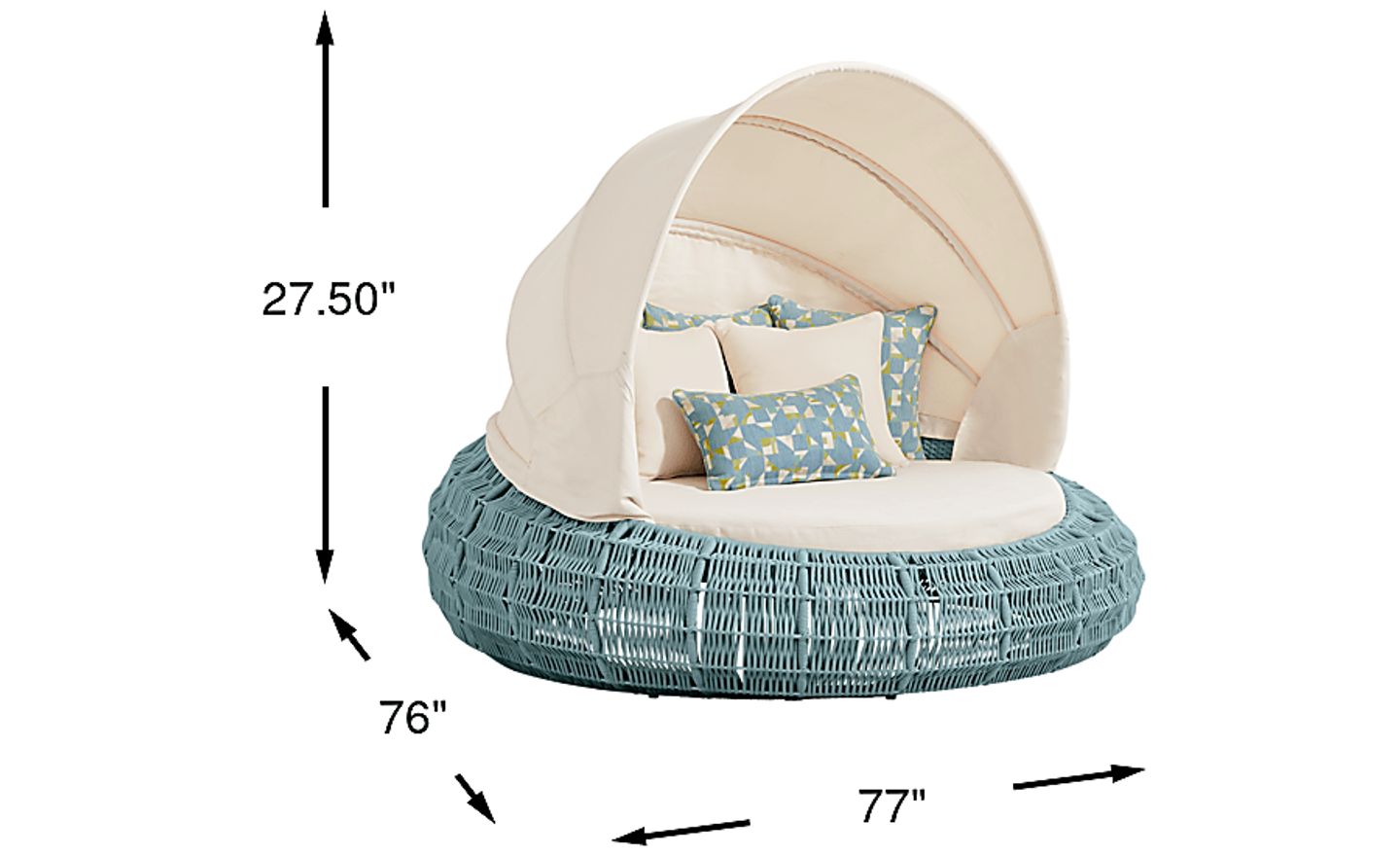 Moments spent stretched out in a dreamlike serenity are moments to cherish on the Malibu daybed, its ultra cozy profile balanced against a sophisticated look made to turn heads and get everyone buzzing. A round frame of rust-resistant aluminum is wrapped in marine grade rope in teal, UV-resistant for lasting color and enjoyment. The collapsible sunshade in beige can be tidied away and secured shut by a simple self-fastening closure when not in use. To add to the inviting comfort of the round beige cushion, six pillows are included in patterned and matching outdoor fabrics to create exactly the support and softness you want for those dreamy afternoon naps on the patio.