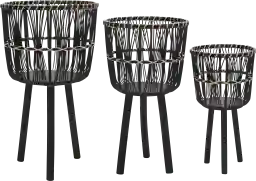 This Mallaga set consists of three planters is supported on angled legs. They come with open caged details. Crafted from bamboo. The round top allows for easy accommodation of almost any plant.