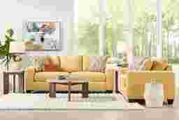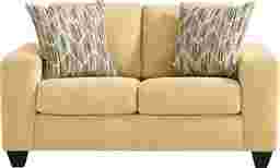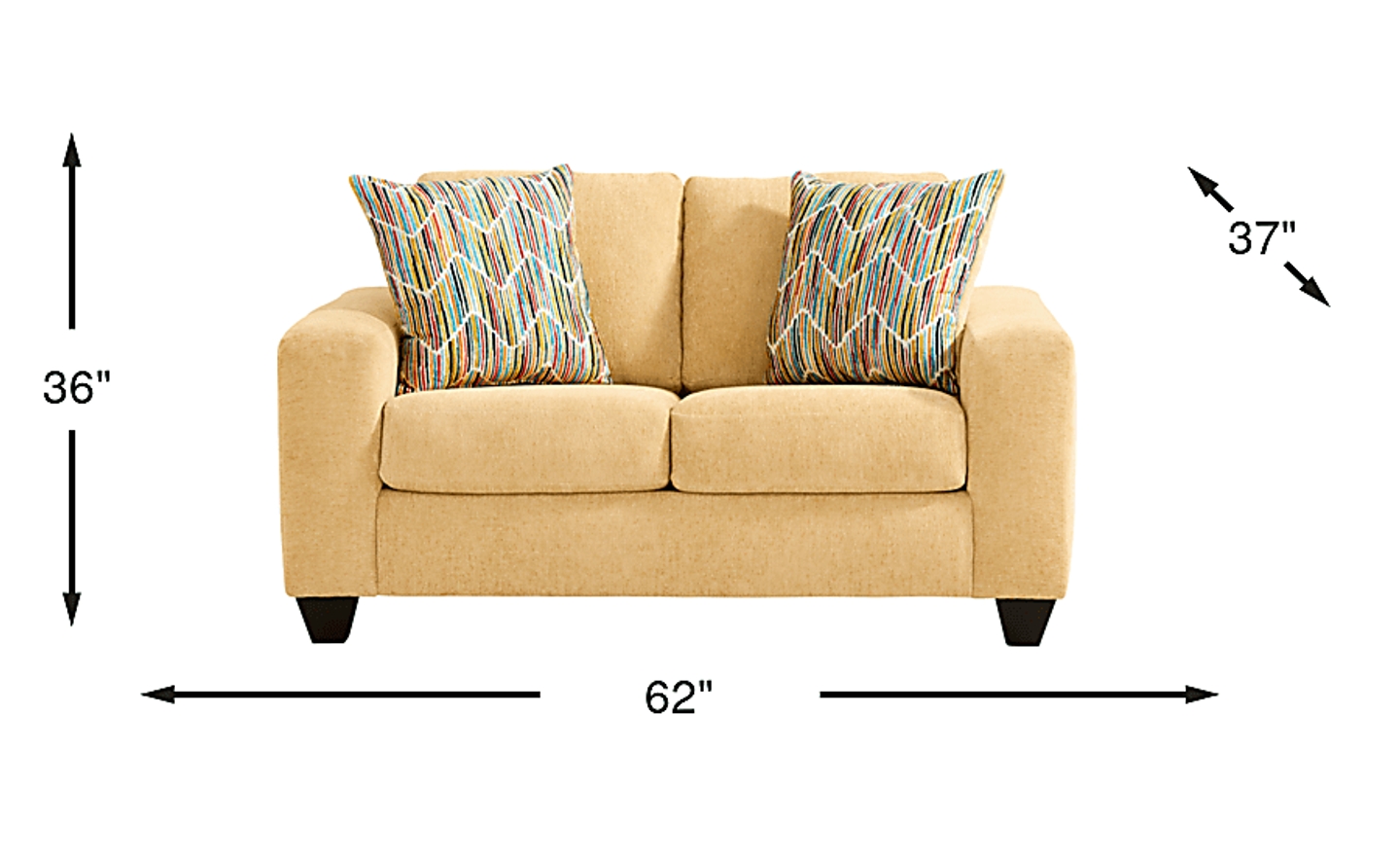 At the end of a long day when relaxation takes priority, a welcoming comfort waits within the Mallard Trace collection's easygoing style and sink-in seating. Upholstered in a soft, textured yellow fabric, this transitional loveseat features gently rounded track arms and deep seat cushions that invite you to settle in and stay awhile. Clean tailoring keeps the look polished, while the included accent pillows add a pop of pattern and personality. Subtly tapered legs in a black finish bring casual charm that feels effortless yet familiar. Upholstery: 100% polyester.