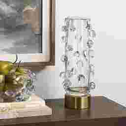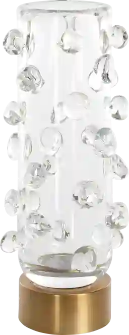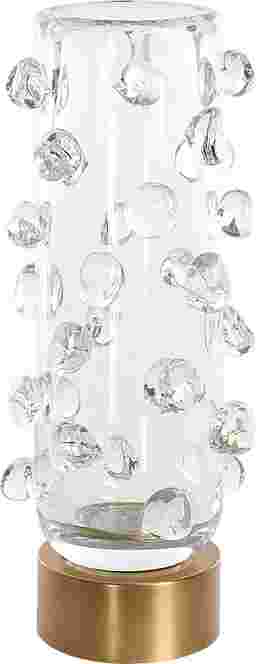 Enhance your home decor with our Malve clear glass vase, adorned with organic glass spheres accenting the outer surface, set atop a brushed brass finished base. This stunning piece combines modern sophistication with artistic flair, making it the perfect addition to any room.
