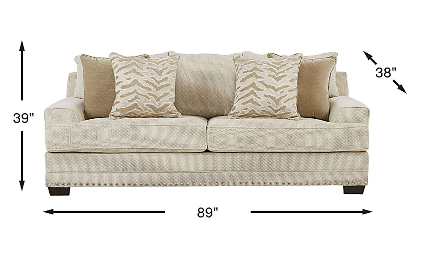 The relaxed contemporary style of the Malvern sofa grants the perfect invitation to your home. Upholstered with woven chenille fabric, this piece is rendered in a versatile beige hue that matches any room decor. Welted track arms and a silver nailhead border along the base bring thoughtful detailing to complement its understated look. Accent pillows, included, come in solid brown and a bold, playful animal print pattern. Adding the final touch, block legs feature a dark brown finish. Reversible seat cushions extend the lifetime of your sofa for more memories in the making. 100% Polyester