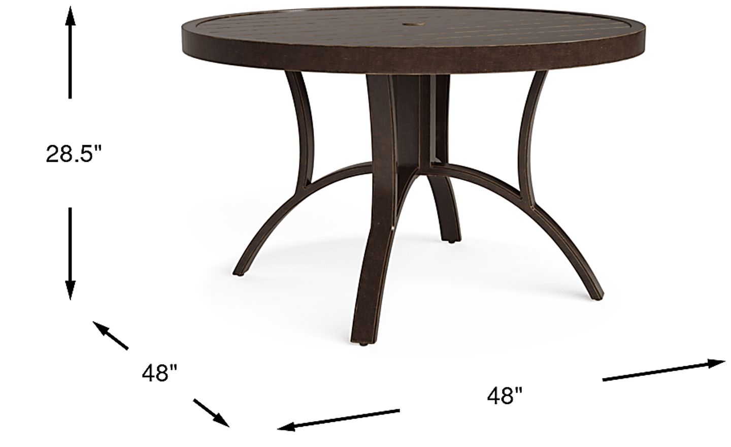 Make outdoor meals memorable with the Manchester Hill dining table. This 48 inch round table features a plank style top and center hole for an umbrella (not included). The table is crafted with a durable, fully welded, rust resistant aluminum frame in a hand-applied antique bronze finish.