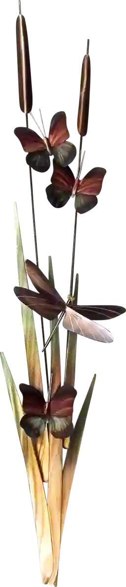 Dragonflies and butterflies rest on cattail stalks in this peaceful scene. The Mandith II wall decor is handmade of stainless steel and colored in vibrant shades. If using outdoors, we strongly recommend limiting direct exposure to water and sunlight by placing it in a covered environment.
