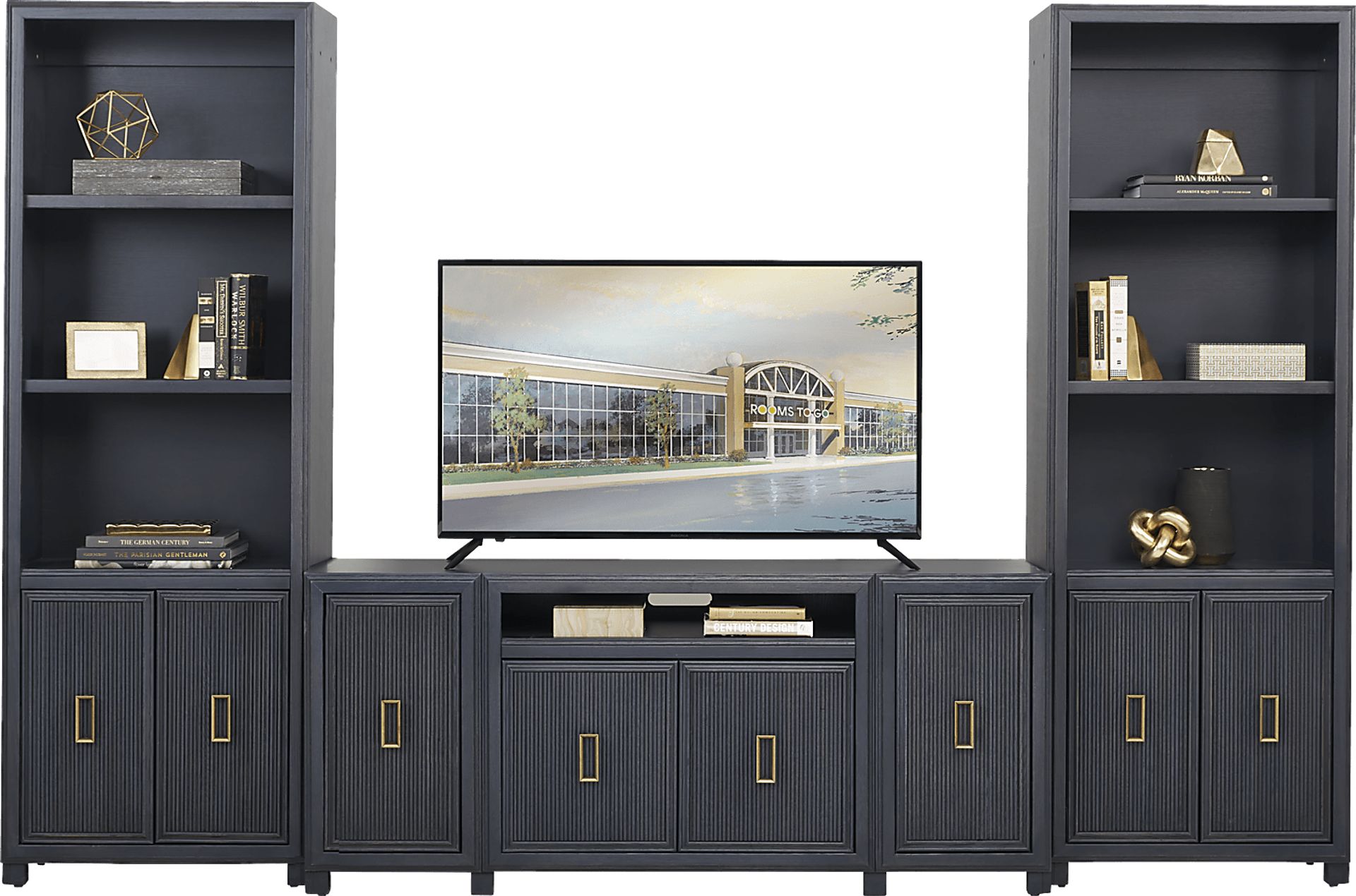 Perfect for storage and display, the Manor Bridge wall unit offers the ultimate home entertainment setup. Crafted of oak solids and maple veneers, it is rendered in a midnight blue finish. The console's four doors and an open cubby reveal shelved space for electronics, games and other items. With one on each side, the piers include two additional doors and two shelves above the console. Brushed nickel hardware with a gold finish and channeling details lend a polished, contemporary look to this piece. Plus, a hole for wire management makes it easy to keep cords neatly hidden from view.