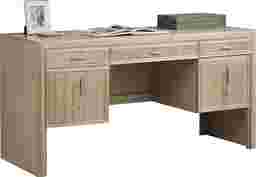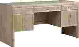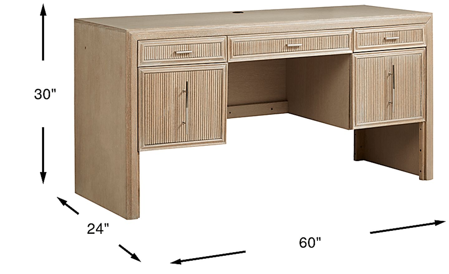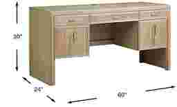 A perfect solution for your home office, the Manor Bridge desk is both chic and space-saving. Crafted of oak solids and maple veneers, it is rendered in a taupe finish. Three small drawers and two large drawers offer plenty of space for a keyboard, writing utensils and file storage. Brushed nickel hardware with a silver finish and channeling details lend a polished, contemporary look to this piece. Plus, a hole for wire management makes it easy to keep cords neatly hidden from view.