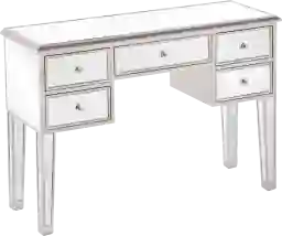 Grace your entryway with this elegantly mirrored Mansur console table. Its beveled mirrored finish, silver painted trim, and crystal style knobs add a glamorous touch to any room. Five drawers offer an assortment of space to keep entryway or vanity items in their place. The beveled mirror top adds depth to accessories and dcor, from flowers or vases to framed art. This console is the perfect alluring piece to complete even your living room or dressing area. Customer assembly required.